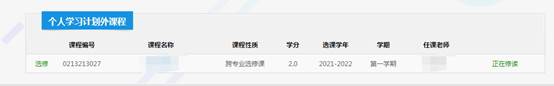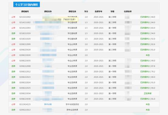 1. 研究生登录研究生新教务系统后,如果在“我的课程”板块出现“个人学习计划外”课程,说明研究生在制定学习计划时未将本课程添加在个人学习计划里。因此,研究生需在“培养—个人学习计划—增加跨专业选修课”页面,将这门课添加在“个人学习计划”里,这样本门课程学分才会有效。