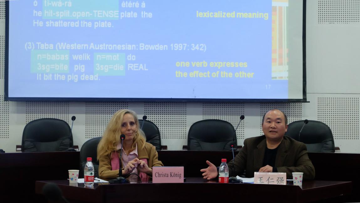 20161123日下午1500,应我校研究生院、词典学研究所和语言哲学及认知科学研究中心的邀请,德国法兰克福大学非洲语言研究部教授Christa König在西区A2-1模拟联合国会议厅举行了题为“语言类型学视野的连动词研究”的学术讲座。讲座由研究生院院长王仁强教授主持,近百名教授、博士及硕士研究生参加了本次学术活动。