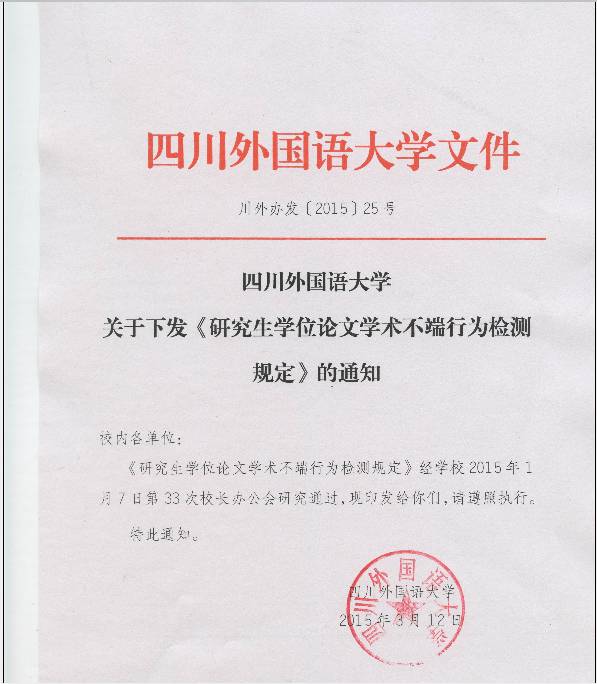 根据《国务院学位委员会关于在学位授予工作中加强学术道德 和学术规范建设的意见》(学位〔2010〕9号)和《太阳成tyc7111cc 关于研究生学位论文学术不端行为检测规定》(川外办发〔2015〕25号)文件精神,学校决定对参加2015年5月论文答辩的所有学位申请人提交的学位论文电子版进行学术不端行为检测,检测时间定在2015年4月10日,本次检测工作由研究生院统一进行。各生检测电子稿文档的命名格式为“论文编号_姓名”(如2015001_张三,论文编号见附件一),本次检测电子稿文档只要论文正文和参考文献(需包含在一个WORD文档里)。 请各二级管理院系研究生教学秘书分专业(方向)收齐本院系论文电子版后于2015年4月9日下午5时前统一发送到sisutdxl@126.com。 研究生院直管专业(方向)由各班班长于2015年4月9日下午5时前收齐本班同学论文电子版统一发送到sisutdxl@126.com(单独发送的,有可能无法顺利接收)。 本次论文为封闭式检测,逾期未提交将无法参与检测及最终论文答辩。检测论文电子版应和最终提交的盲审版论文保持一致,我院将对检测论文电子版和盲审论文进行比对,出现不一致情况的将严肃处理、直至取消答辩资格。 本次检测结果将严格按照《太阳成tyc7111cc关于研究生学位论文学术不端行为检测规定》(川外办发〔2015〕25号)的相关规定执行。 请大家相互转告! 附件一:《太阳成tyc7111cc关于研究生学位论文学术不端行为检测规定》 附件二:《申请2015年5月论文答辩编号》 太阳成tyc7111cc研究生院 2015-03-23 附件一:  太阳成tyc7111cc 关于研究生学位论文学术不端行为检测 规定 为加强学术道德和学术规范建设,培养研究生的优良学风,防范学术不端行为,根据《国务院学位委员会关于在学位授予工作中加强学术道德和学术规范建设的意见》(学位〔2010〕9号)文件精神,特此制定太阳成tyc7111cc关于研究生学位论文学术不端行为检测规定。 一、检测机构和范围 学校授权研究生院对所有申请我校学位的研究生学位论文进行学术不端行为检测。 二、技术手段 我校目前采用中国知网(CNKI)研发的“学术不端文献检测系统”对学位论文进行检测。 三、检测时间 检测工作在学位论文答辩前完成。 四、检测方式 100%全检。 五、送检要求 待检学位论文必须为Word格式电子稿文档并与同时提交的盲审纸质文档完全一致。电子稿文档的文件夹命名格式为“论文编号_姓名”(如2011001_张三),只需提交含论文主体、参考文献的一个WORD文档。 六、检测结论及处理办法 检测结论以论文主体的文字复制比为依据(文字复制比已除去引用及本人已发表的相关文献)。 (一)博士学位论文、硕士学位论文文字复制比小于15%为合格。 (二)博士学位论文、硕士学位论文文字复制比大于15%且小于25%为不合格。申请人须在导师指导下对学位论文修改一次并申请重新检测,二次检测论文复制比降到15%以下后可正常参加论文答辩。仍不合格者,推迟半年后方可再次申请论文答辩。 (三)博士学位论文、硕士学位论文文字复制比大于25%,由研究生院聘请两名同行专家进行复审。若被确定为学术不端行为,推迟1年后方可再次申请论文答辩。 (四)博士学位论文、硕士学位论文文字复制比大于10%的,不具备校级及以上级别优秀学位论文的推选资格。 七、本规定自公布之日起实施,原《四川外语学院关于研究生学位论文学术不端行为检测暂行规定》(川外办〔2011〕17号)同时废止。 八、本规定由研究生院负责解释。 2015届研究生论文编号.xls |