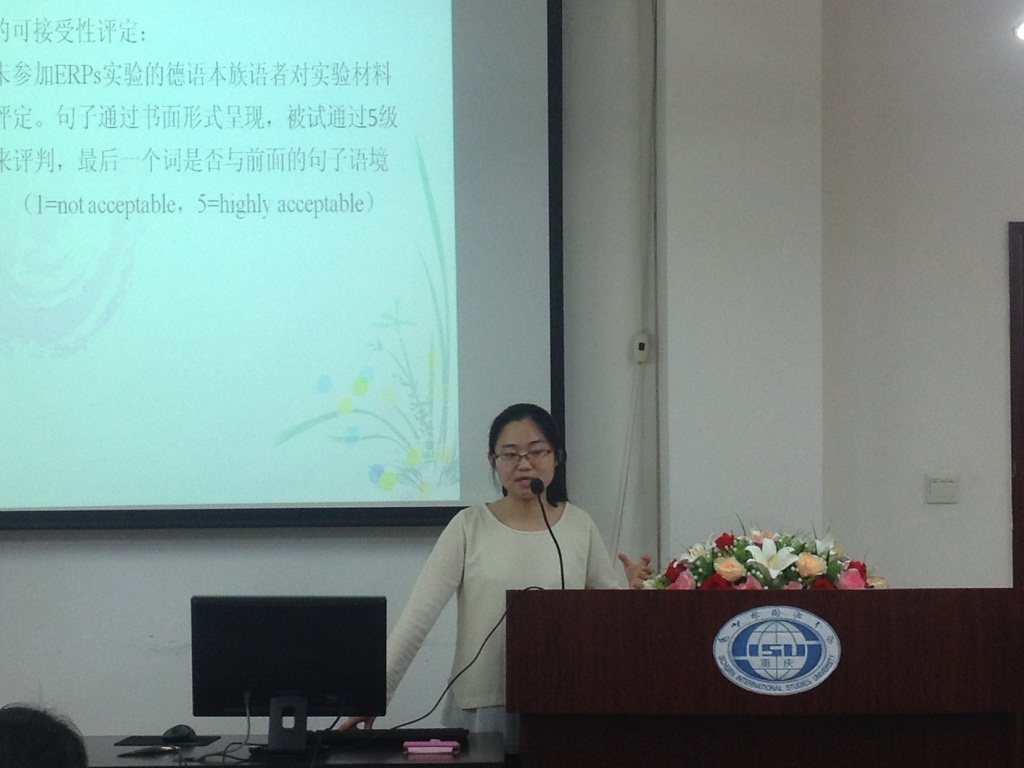 2016年4月7日晚上7:00,川外学坛“学子之星”学术讨论会在博文楼六楼报告厅如期举行。本次讨论的主题是“认知加工中的脑电成分之ELAN与LAN”,主讲人为2014级研究生潘雪瑶同学和郑贵兰同学。讨论会由荣婷婷同学主持,姜孟教授出席,此外各年级研究生参加了本次学坛活动。