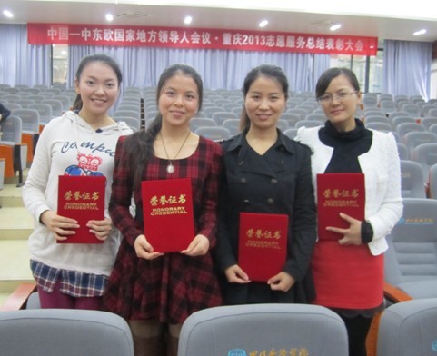 我院王琴、王若丁、王嘉琦、张金梅、林莹、胡倩、徐洁、浦潇续、魏晓艳9名同学获中国——中东欧国家地方领导人会议•重庆2013优秀志愿者称号。