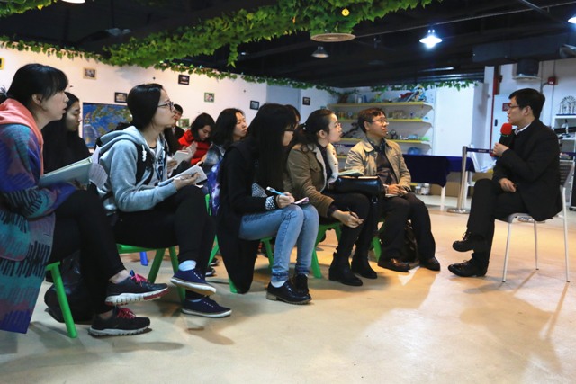 量子猫科学馆CEO李志峰博士(右一)与川外师生对话科学教育产业