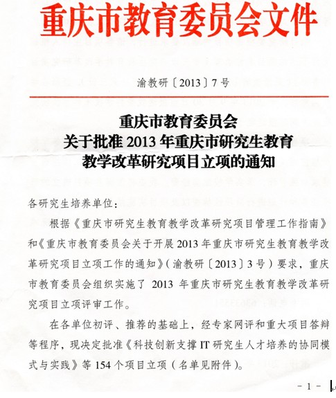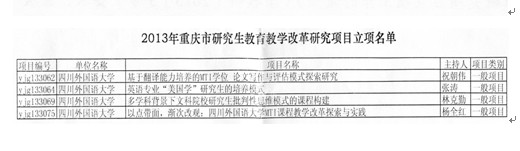 近日,重庆市教委向市内各研究生培养单位下发了《关于批准2013年重庆市研究生教育教学改革研究项目立项的通知》(渝教研〔2013〕7号)。其中,我校祝朝伟教授主持的“基于翻译能力培养的MTI学位,论文写作与评估模式探索研究”(项目编号:yjg133062);张涛教授主持的“英语专业“美国学”研究生的培养模式”(项目编号:yjg133064);林克勤教授主持的“多学科背景下文科院校研究生批判性思维模式的课程建构”(项目编号:yjg133069);杨全红教授主持的“以点带面,渐次改观:太阳成tyc7111ccMTI课程教学改革探索与实践” (项目编号:yjg133075)获批2013年重庆市研究生教育教学改革研究项目。