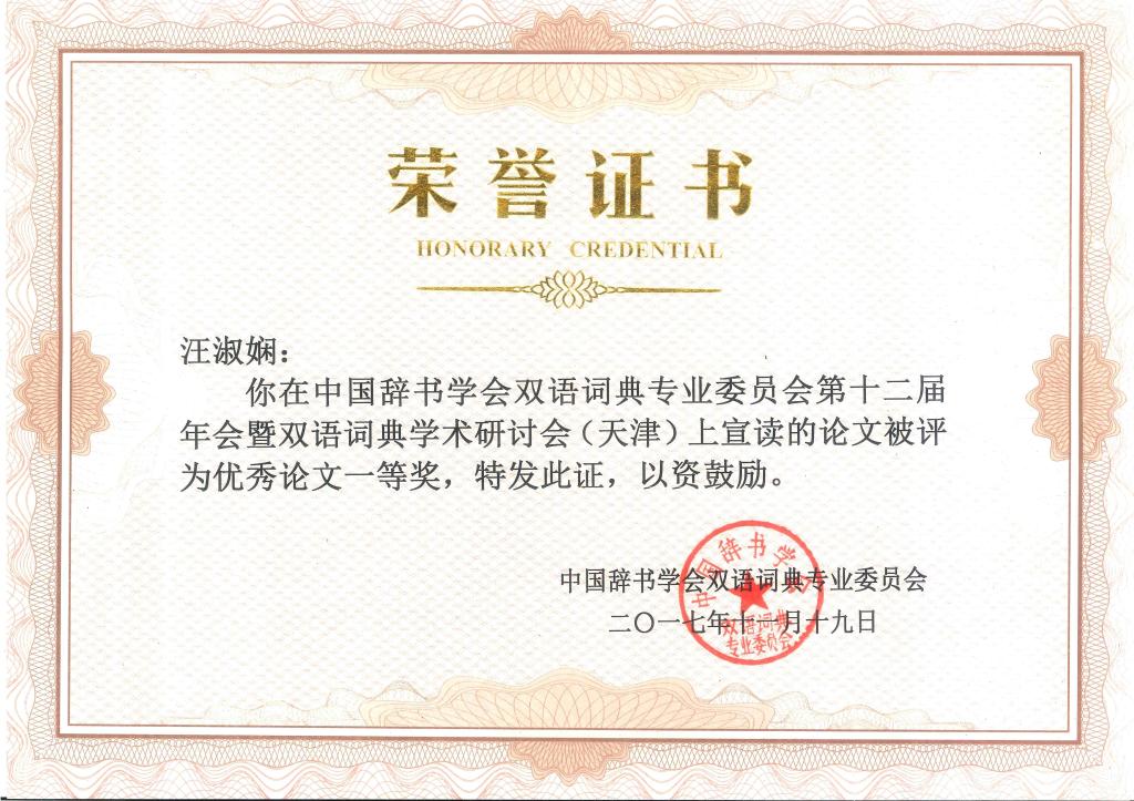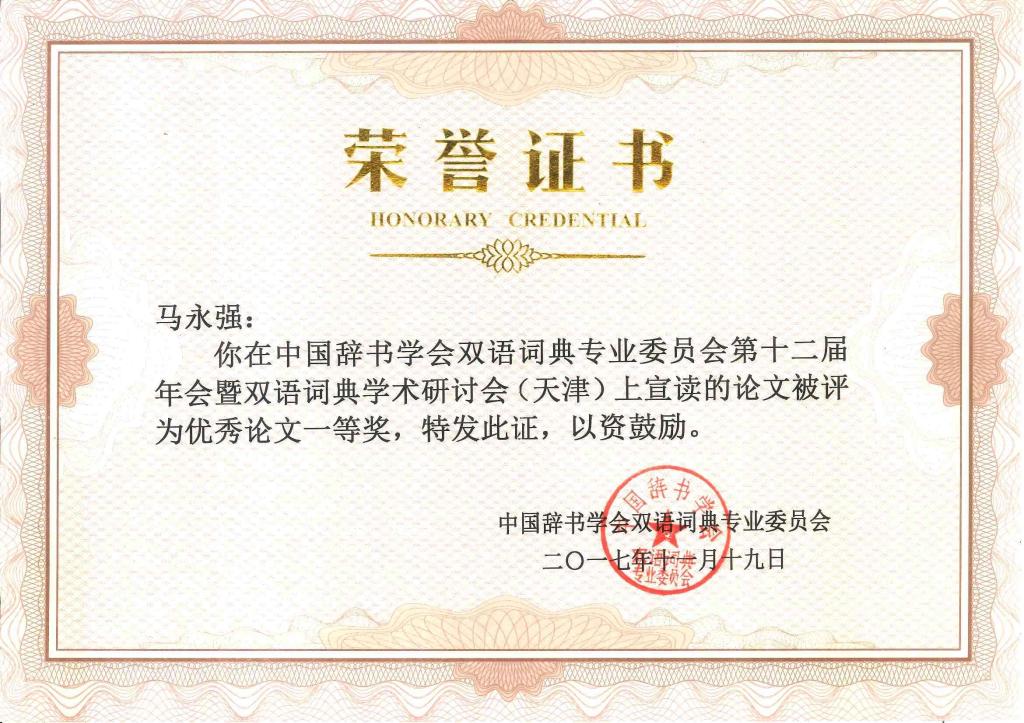 11月18日下午,大会采取全体与会者无记名投票和双语词典专业委员会常务理事会集中讨论的方式,推选出了10篇青年学者优秀论文,其中一等奖3篇,二等奖3篇,三等奖4篇。我校博士生马永强的论文“基于复杂适应系统语言观的现代汉语新词词化研究——以‘高大上’为例”和硕士生马宁、汪淑娴和霍忠振的论文“汉英词典中‘启发’的词类标注问题及对策——一项基于双层词类范畴化理论的研究”分别获得本次大会优秀论文评选一等奖。霍忠振同学还作为优秀论文一等奖获得者代表做大会发言。我校一次性囊括青年学者优秀论文奖3项一等奖中的2项,这无疑是对我校词典学人才培养质量的高度肯定。