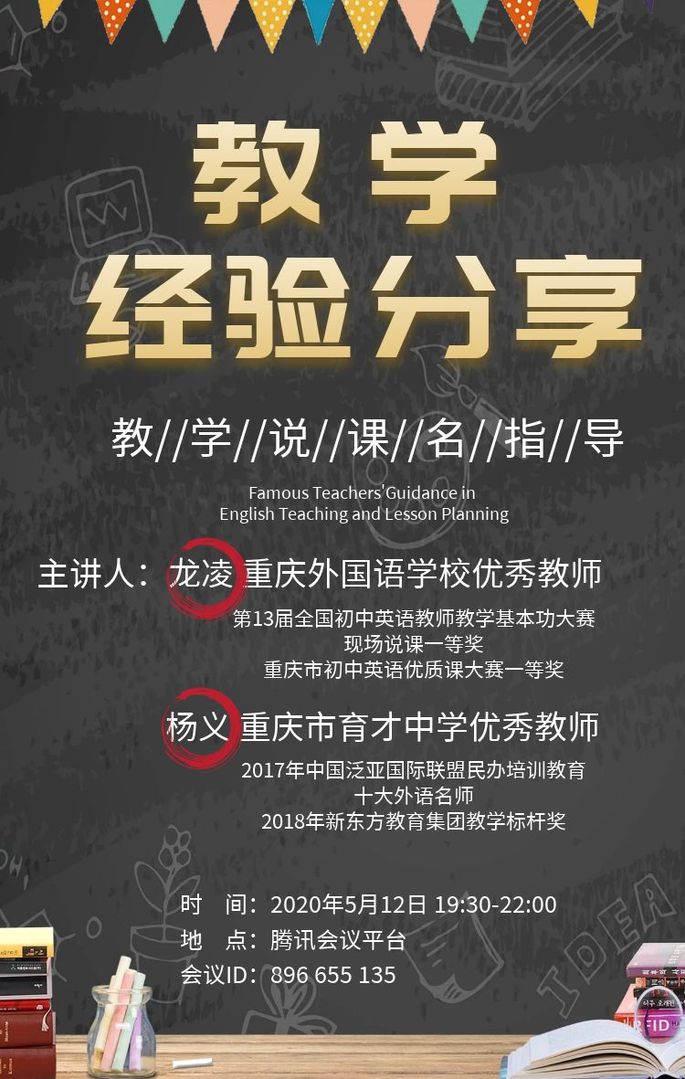 疫情期间,为指导和帮助毕业年级学生更好地就业,2020年5月12日晚19:30,研究生院导师刘玉梅教授结合2019-2020春季课程《外语课堂教学模式研究》教学内容,组织开展了一场中学资深教师“教学经验分享与就业指导”线上交流活动。重庆外国语学校优秀教师龙凌老师和重庆市育才中学优秀教师杨义老师,应邀以线上腾讯会议的形式,为我校研究生开展了教学经验以及说课面试等方面的分享和指导,据悉一些本科毕业生也参加了活动。