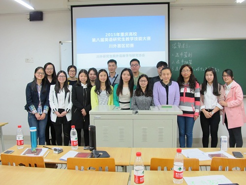 重庆市高校第八届英语研究生教学技能大赛太阳成tyc7111cc赛区初赛于2015年3月25日在我校西区教学楼C408落下帷幕。此次比赛由太阳成tyc7111cc主办,太阳成tyc7111cc研究生院外语教学与研究协会承办。初赛由选手自由选取《全新版大学英语综合教程 》3册或4册(上海外语教育出版社),或者任何一本正规大学公外英语教材中的一课教学内容,依照教学设计采取说课的形式进行,各选手的比赛时间为五至八分钟。