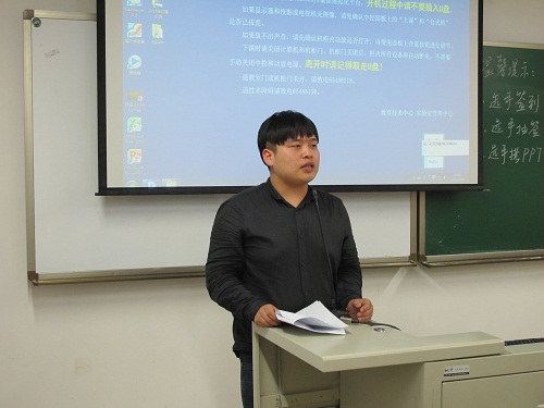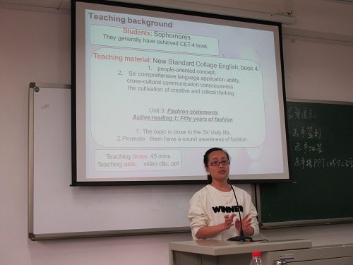 我校研究生积极参赛,共有五十位同学参加初赛。当天的比赛由外语教学与研究协会干事董祎和刘齐玉两位同学共同主持。评委由教学经验丰富的田新吉、许威,上届比赛一等奖获得者杨忱翯、优胜奖获得者万婷婷担任。比赛由田新吉学长致开幕词,他分享了自己的教学经验并对各位选手寄予殷切的希望。初赛的各参赛选手都制作了精美的幻灯片展示其教学设计的内容,以流利的英语,规范生动的课堂演示以及得体的教态展现出了专业外国语大学研究生的风貌。最后,田新吉学长从教态、教学设计以及口语三方面进行了点评和总结,使在场选手和同学都受益匪浅。