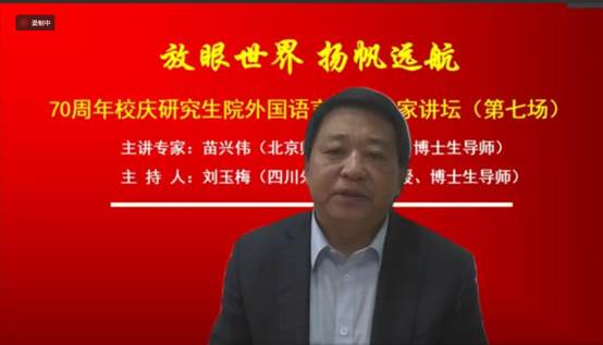 “太阳成tyc7111cc70周年校庆研究生院外国语言文学名家讲坛”第七场讲座暨界面研究与认知诗学论坛(第134期)学术活动于2020年10月19日晚上7点在腾讯会议平台如期举行。本次活动特邀北京师范大学苗兴伟教授做题为“生态文明视域下生命共同体的话语建构”的学术讲座。讲座由我校刘玉梅教授主持,众多青年教师、硕/博士研究生聆听了本次讲座。