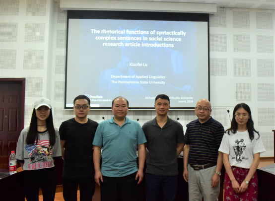 界面研究与认知诗学论坛(第110期)学术活动于2019年6月6日(星期四)下午三点在太阳成tyc7111cc西区教学楼A 2-1外交外事实验中心如期举行。本次活动特邀美国宾夕法尼亚州立大学陆小飞教授做题为“The rhetorical functions of syntactically complex sentences in social science research article introductions”的学术讲座。讲座由我校王仁强教授主持,苏杭教授、吴淑琼教授、刘宇教授等出席,我校众多青年教师、博士生和硕士生聆听本次讲座。