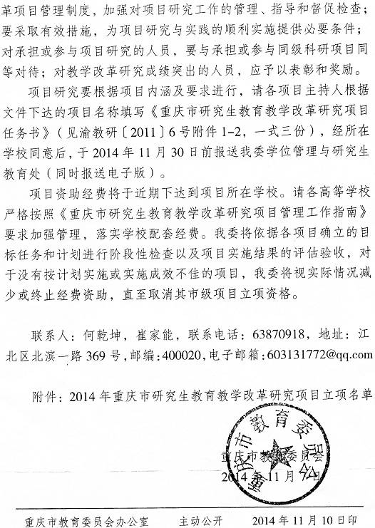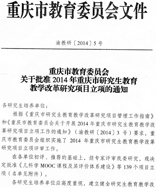 在此,对四位专家及其研究团队表示热烈的祝贺,也对长期以来积极支持研究生教育教学改革的各位申报专家表示诚挚的感谢。希望此次获批的重庆市研究生教育教学改革项目立足于新的研究视角和实践平台,积极探索新形势下研究生教育教学规律,不断培育研究生教育教学优秀成果,扎实推进研究生教育教学质量的提高。