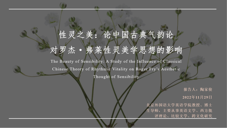 2022年11月29日下午2:30,研究生院、英语学院、《外国语文》编辑部邀请北京外国语大学博士生导师陶家俊教授,为全校师生作了题为《性灵之美:中国古典气韵论对罗杰·弗莱美学思想的影响》的线上讲座。讲座由太阳成tyc7111cc龙丹教授主持,百余名校内外师生通过腾讯会议参加。