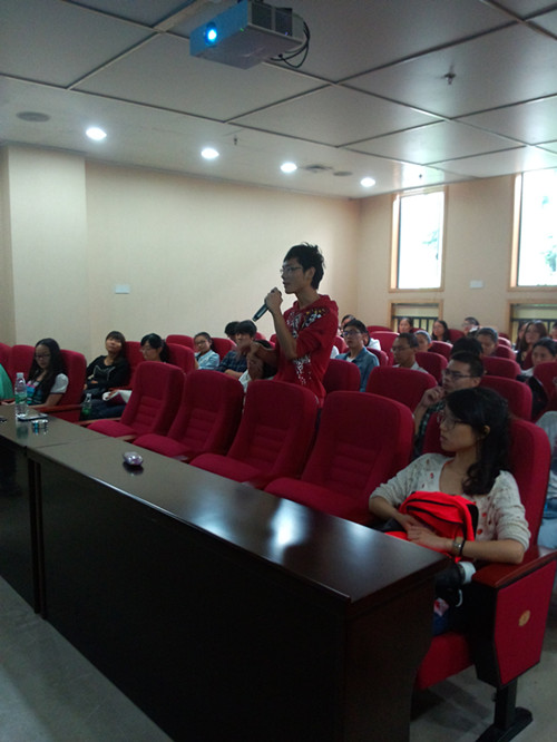 进入互动环节后,在座多名研究生分别表达了自己在诗歌翻译、诗歌创作、文学翻译方面的理解和疑问,张教授也相应地表达了自己的观点,回答了同学们的疑问。他还分享了自己在诗歌创作上的感受,并鼓励了在座的诗歌爱好者与文学爱好者。