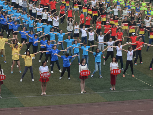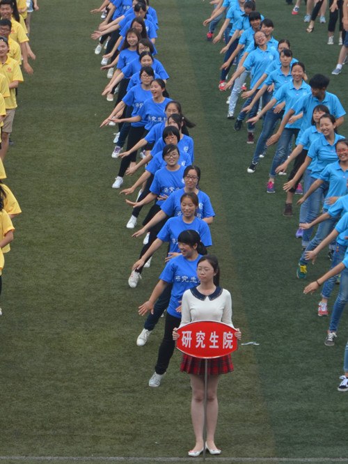2015年4月28日下午5时,在各项竞技赛事相继落幕之后,本届川外春季运动会步入尾声,并在西校区操场上迎来运动会最后一场赛事——学生团体“舞动中国”表演。研究生院“舞动中国”团队和来自全校其他院系的代表队们一起,为全场观众呈现了一场精彩的视觉盛宴。“万人广场舞”般的浩荡气势将本次运动会推向了最后一个高潮,为本次运动会划上完美的句点。为了准备本次表演,我院团队队员们在近一个月的时间里坚持进行赛前排练,比赛时,研院团队队员们整齐划一的动作,轻快灵动的舞步,热情洋溢的笑容,赢得了评委和观众们阵阵掌声。感谢各位队员们的努力付出和精彩表现!