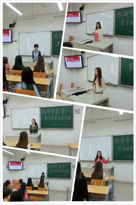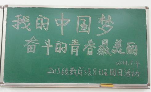 5月4日,2013级8班团支部开展了题为《“我的中国梦”——奋斗的青春最美丽》纪念五•四运动95周年主题团日活动。本次团日活动由团支书(段媛媛)组织,其他班委协助完成。其中班长(杨忱翯)负责致活动开场词,团支书负责主持和活动总结的撰写,宣传委员(谢姣玲)等班委负责宣传动员工作现场以及活动图片采集等。