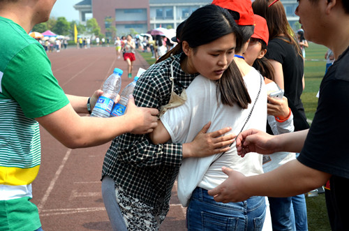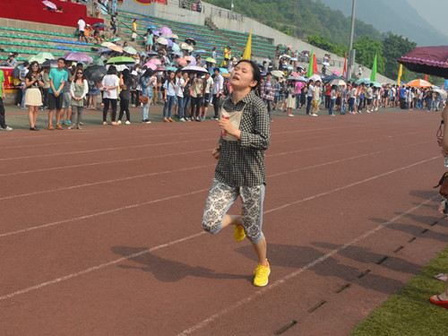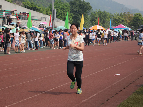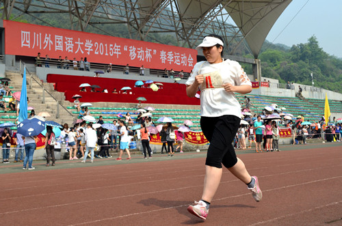 2014年4月28日上午9:50,2015川外春季运动会学生组女子1500米决赛在西校区体育场举行。研究生院王紫、邬登菊和荣婷婷三位同学与来自其他院系的66名同学一起参加此项比赛的角逐。比赛共分成三组进行,参赛选手们顶着炎炎烈日奋力奔跑,即使体力透支也要坚持到终点。最终,经过激烈残酷的角逐,邬登菊获得小组第二的好成绩,并以6分41秒50的成绩排名第11,荣婷婷以7分24秒66的成绩排名第37。