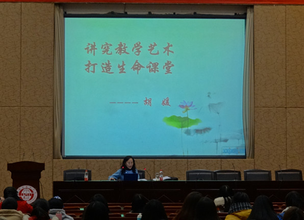 接着,她为同学们详细解读了打造“生命课堂”的方法。第一、老师应该对课堂有科学的设计。胡老师指出,科学的设计包括四个方面:选材的科学性、目标的科学性、课件制作的科学性和教学方法的科学性。其中,胡老师特别强调了课堂上问题设计的科学和活动设计的科学,问题的设计要有针对性、自然性和激情性,活动的设计要有实用性、创造性和谐悦性,老师要努力让学生感受语言、熟悉语言、理解语言和运用语言。第二,老师要对课堂的节奏、过程和内容有很好的把控。胡老师说,课堂要有精要之美、精当之美、精深之美和精彩之美,此外,老师还要努力让课堂有人文性,除了关注学习水平和结果外,更要关注情感因素,帮助学生建立自我认知和自信。第三、老师应该使课堂具有艺术性。胡老师指出,教师的语言修养极大程度地决定了学生课堂脑力劳动的效率。她以阅读为例,讲解了课堂的结构艺术,令同学们受益匪浅。此外,她还指出,老师应该注重教学探究力度和创新思维程度,注重思维拓展和智慧升华程度,注重教学的鲜明独特性。
