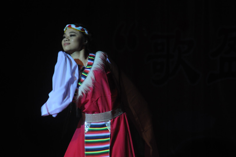 学校图书馆馆长何天云老师在这一篇章带来了经典曲目《天堂》,何老师声音高亢浑厚,饱含深情,将晚会推向了另一个高潮。何馆长与三名身着藏族服饰的女生载歌载舞,一曲听罢,同学们在现场微博墙互动中大呼,“何老师,再来一曲!”