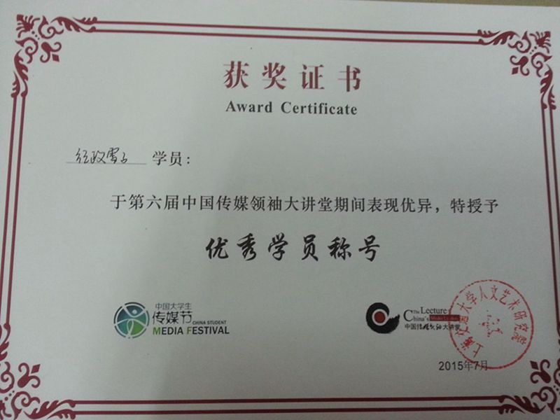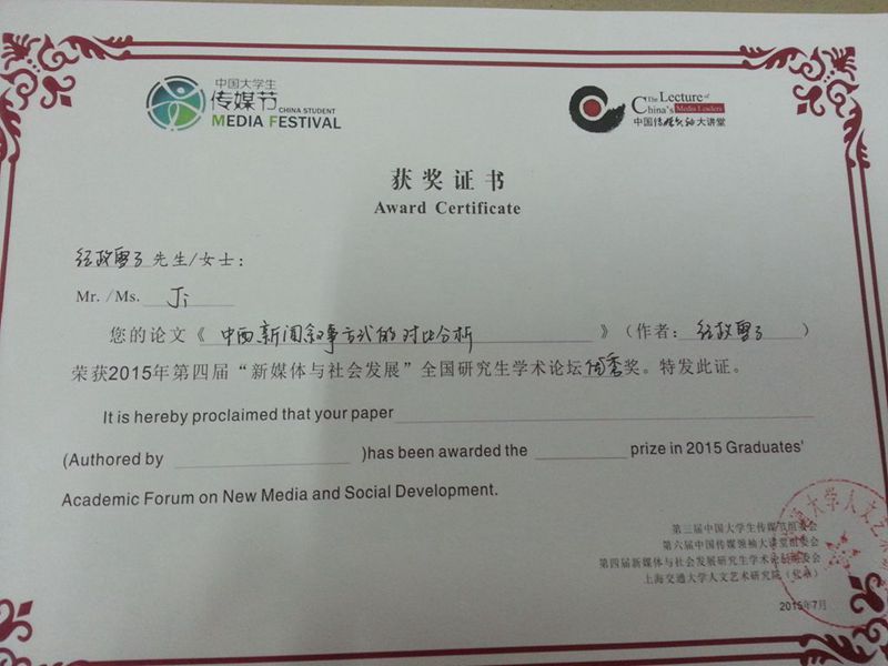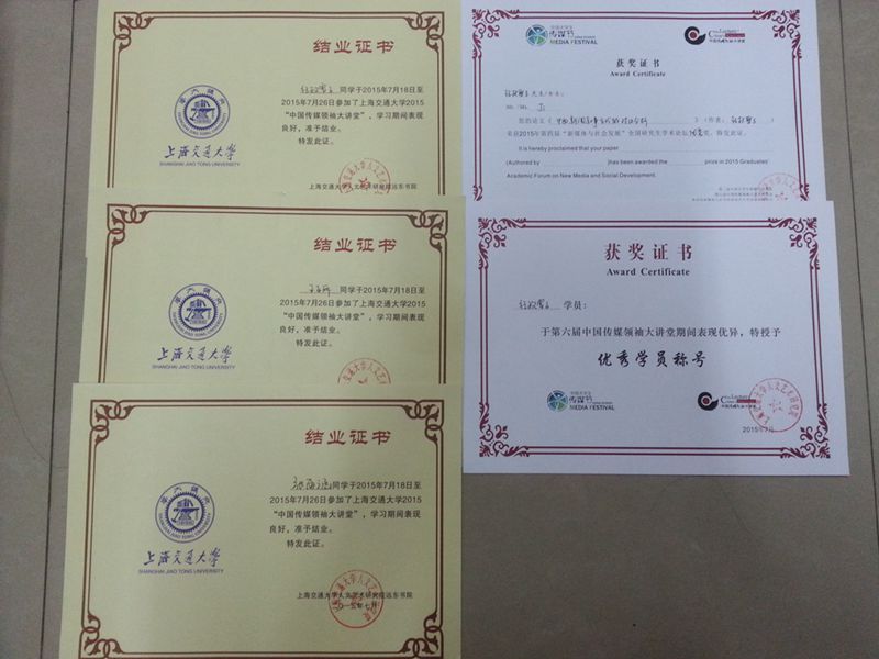 7月27日下午,第六届传媒领袖大讲堂系列学术交流活动在上海交通大学闵行校区圆满结束。我校新闻传播学院院文艺与传媒专业2013级研究生纪政雪子、2014级研究生王秋旭、王亚丽,2011级本科生张雨涵参加了这次学术活动并喜获佳绩。该活动由上海市学位委员会主办,上海交通大学人文艺术研究院远东书院和研究生院承办。 2015年7月19日—7月27日,上海交通大学远东书院在连续5年成功举办“中国传媒领袖大讲堂”的基础上,继续举办为期9天的“中国传媒领袖大讲堂”暑期讲习班。来自海内外160多所高校的350余名学子汇聚一堂,展示了当代传媒学子的靓丽风采。在7月27日的第六届中国传媒领袖大讲堂系列活动闭幕式上,上海交通大学为参会的青年教师、研究生、本科生颁发了结业证书。其中我校新闻传播学院文艺与传媒专业2013级研究生纪政雪子获得了优秀学员荣誉证书,会议录用论文《中西新闻叙事方式的对比分析》获得优秀论文奖,2014级研究生王秋旭、王亚丽,2011级本科生张雨涵均以良好成绩获得结业证书。 在活动的最后,学员们纷纷上台和老师、工作人员合影留念,第六届中国传媒领袖大讲堂完美落幕。 第六届传媒领袖大讲堂系列学术活动是上海交通大学远东书院以公益方式开办的面向上海及全国新闻传播学研究生的“暑期学校”。讲堂每年邀请中外最为顶级的传媒领军人物与全国各大高校新闻学子对话交流。本次系列学术活动包括本次活动包括以下项目:一个大讲堂——上海市研究生暑期学校“中国传媒领袖大讲堂”,四大传媒论坛——新媒体与社会发展全球论坛、中国品牌传播高峰论坛、新闻期刊主编论坛、新媒体与社会发展研究生学术论坛,两场晚会——中国大学生传媒节开幕式、闭幕式晚会,两个调查报告——2015年中国大学生媒体使用习惯调查报告、2015年中国大学生传媒品牌认知调查报告。