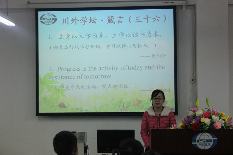首先,2013级研究生曹颖同学向全体师生分享了本次学坛的两则箴言:“立身以立学为先,立学以读书为本。——欧阳修”及“Progress is the activity of today and the assurance of tomorrow. ——Emerson”。