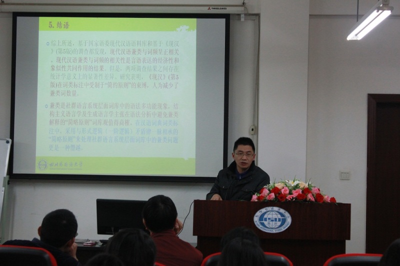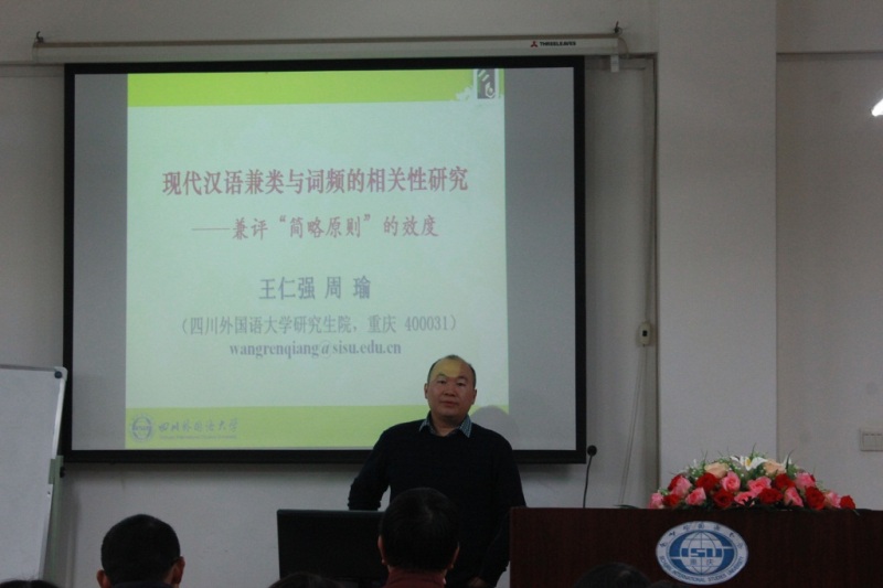 川外学坛举行题为“现代汉语兼类与词频的相关性研究”的学术讲座 2015年12月10日晚上19:00,我校研究生院院长、博士生导师王仁强教授应邀在博文楼六楼报告厅举行题为“现代汉语兼类与词频的相关性研究——兼评‘简略原则’的效度”的学术讲座。此次讲座由姜孟教授主持,李龙泉教授、胡文飞教授、马武林教授、陈英博士、王礼亮博士等教师出席,近百名博士、硕士研究生也参加了本次学坛活动。 在报告开始前,姜孟教授首先向同学们简要介绍了王仁强教授的学术背景及其丰硕的学术成果,并对王教授的到来表示热烈的欢迎。 之后,王仁强教授开始作主题报告。本次报告主要包括五个部分。首先,王教授旁征博引,最后从复杂适应系统语言观视角对“兼类”进行了界定,并指出以词典为基准进行兼类研究才有助于把握兼类问题的本质。针对前人有关兼类与词频相关性研究的缺陷(如研究设计缺陷、结论与主流观点“简略原则”之间的矛盾等),王教授以复杂适应系统语言观为理论基础,基于国家语委现代汉语语料库和《现代汉语词典》(第5版)词类标注数据库,对现代汉语兼类与词频的相关性开展了实证研究。王教授从数据搜集、数据处理两个方面简要阐述了研究设计,可见其研究过程之严谨。紧接着,王教授对《现汉》(第5版)的统计结果、国家语委现代汉语语料库的统计结果及其两者间的对比结果进行了分析,清晰直观地证明了兼类现象随着词频降低而降低。然后,王教授对统计结果进行了深入细致的讨论,指出兼类与词频的相关性是言语交际的经济性和象似性共同作用的结果,也是复杂适应系统语言观的真实体现。王教授指出主张兼类要少的“简略原则”违反了兼类词的基本定义,不恰当地运用了矛盾律,同时与兼类同词频的相关性背道而驰。最后,王教授对本次报告作了简明扼要的总结。他强调,现代汉语兼类与词频呈正相关,现代汉语兼类与词频的相关性是言语表达的经济性和象似性共同作用的结果;兼类是社群语言系统层面词库中的语法多功能现象,“简略原则”词库观值得商榷。王教授建议,在现代汉语词类研究中,要尊重汉语语言使用事实,收起“奥卡姆剃刀”,摆脱“简约原则”束缚。王教授的报告充满思想活力,国际气息浓郁;其讲解循序渐进,逻辑清晰,充满学术魅力,营造了浓厚的学术氛围,为大家带来了一场视听盛宴。 在自由讨论部分,现场部分教授及研究生就自己的疑惑与王仁强教授进行了热烈互动,现场气氛十分活跃。之后,胡文飞教授对王教授的讲座进做了简要点评。胡教授指出,第一,王教授向大家展示的是经典研究范式,即以问题为导向,在分析问题中不断地提升,整个研究逻辑清晰、思路开阔。第二,王教授的研究表明实证研究都是以数据说话。做词典研究,不仅要有数据,还要与实证目的相联系,最终归回到改进词典编撰工作中去。第三,王教授的报告启示我们,文科研究是一个厚积薄发的过程,学术涵养需要平时一点一滴的积累。 在讲座接近尾声时,姜孟教授对王教授的讲座作了扼要解读和点评。首先,他指出,此次讲座信息量大,充满洞见。王教授基于自己丰厚的学养,从复杂适应系统理论立场出发来看待语言的本质;以严谨的批判性思维为站点,提出了“双层词类范畴化理论”,针对语言中的词语兼类及词典编撰中处理词语兼类的“简略原则”,在事实上提出了“不简不略”的原则或“事实原则”,富有创意而令人信服。最后,姜教授指出王教授的研究体现了国际视野和词典学研究前沿,是一场启迪学术人生的精神盛宴。 本次讲座在大家热烈的掌声中圆满结束。 (2015级研究生李爱莲报道) 附:照片 1.王仁强教授作报告