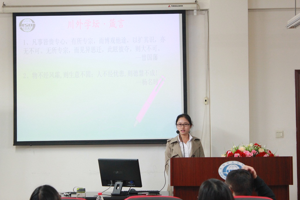 首先,2015级研究生王霞同学向大家分享了两则她精心挑选的箴言:“凡事皆贵专心,有所专宗,而博观他途,以扩其识,亦无不可。无所专宗,而见异思迁,此眩彼夺,则大不可”;“物不经风霜,则生意不固;人不经忧患,则德慧不成!”这两则箴言启示我们,做任何事情都贵在专心和坚持,一门深入,长时熏修,并历经磨练才能在品德智慧和事业生活上有所成。