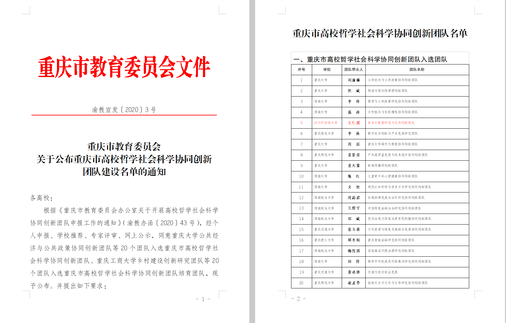 根据《重庆市教育委员会办公室关于开展高校哲学社会科学协同创新团队申报工作的通知》(渝教办函〔2020〕43号),经个人申报、学校推荐、专家评审、网上公示,全市共有20个团队入选重庆市高校哲学社会科学协同创新团队。