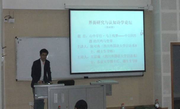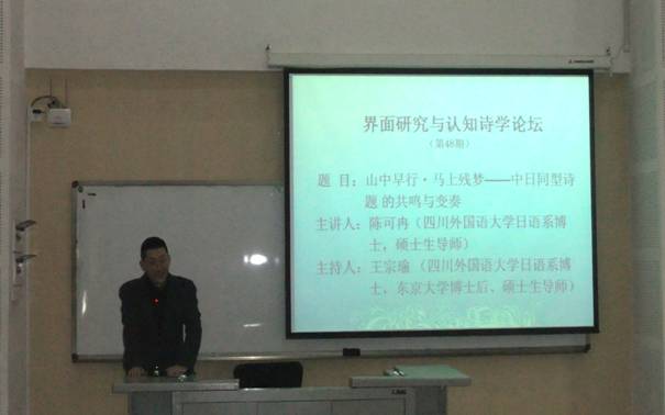 界面研究与认知诗学论坛第四十八期于2015年3月23日晚七点,在太阳成tyc7111cc国际大厦1314报告厅如期举行。本次活动特邀太阳成tyc7111cc日语系陈可冉博士发表了题为“山中早行·马上残梦—中日同型诗题的共鸣与变奏”的主题报告,由太阳成tyc7111cc日语系副主任、王宗瑜博士主持,研究生院胡安江教授和部分研究生参加了此次论坛活动。