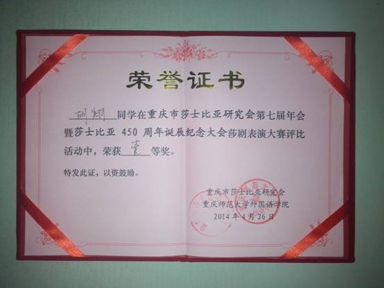 2014年4月26日,在重庆师范大学校友会堂音乐厅召开了“重庆市莎士比亚研究会第七届年会暨莎士比亚450周年诞辰纪念大会”。在大会的莎剧表演大赛中,我院2012级日语专业研究生胡翔同学加入的国际商学院博弈剧社(Game Theory Troupe)表演了经典莎剧《仲夏夜之梦》(节选)。该剧以明白晓畅的剧情,活泼又不失真挚的演出获得观众、评委的一致肯定,最终获得一等奖。其中,我院胡翔同学饰演了仙王Oberon一角。