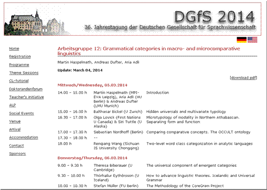 阳春三月,德国马尔堡市已经春暖花开。3月5日至7日,德国语言学会第36届年会在成立于1527年的德国马尔堡大学举行。本届年会的主题是:“God Particles” of Language? Theoretical and Empirical Approaches and the Future of Linguistic Categories(语言的“上帝粒子”?语言范畴的理论研究与实证路径及其未来趋势)。1964年预测到“上帝粒子”的两位科学家Peter W. Higgs和François Englert已于2013年10月荣获诺贝尔物理学奖。“上帝粒子”亦称“希格斯玻色子”,它是构成宇宙最基本组成部件之一的一种亚原子粒子。最近20年来,语言基本范畴问题成了语言学研究的一个热点和难点,因此本届年会吸引了来自世界20多个国家的150多名从事语言学、认知科学、生物学和人类学等相关学科的专家参会。本届年会共邀请了来自4个国家的4位知名学者做大会主旨发言,学术研讨分成11个论坛进行。其间,马尔堡市市长还举行了招待酒会,欢迎来自世界各国的参会代表。我校博士生导师、研究生院院长王仁强教授应邀出席本届年会,并于当地时间3月5日下午在“Grammatical Categories in Macro- and Microcomparative Linguistics”论坛上与来自英国剑桥大学等11个国家17所大学的学者进行深度交流。