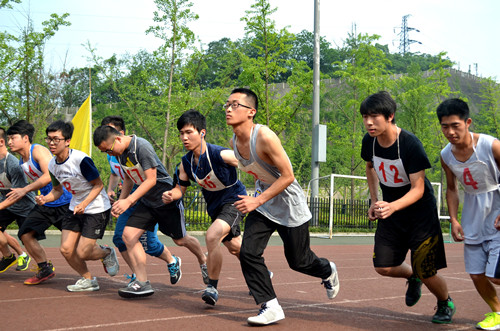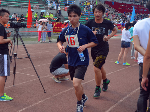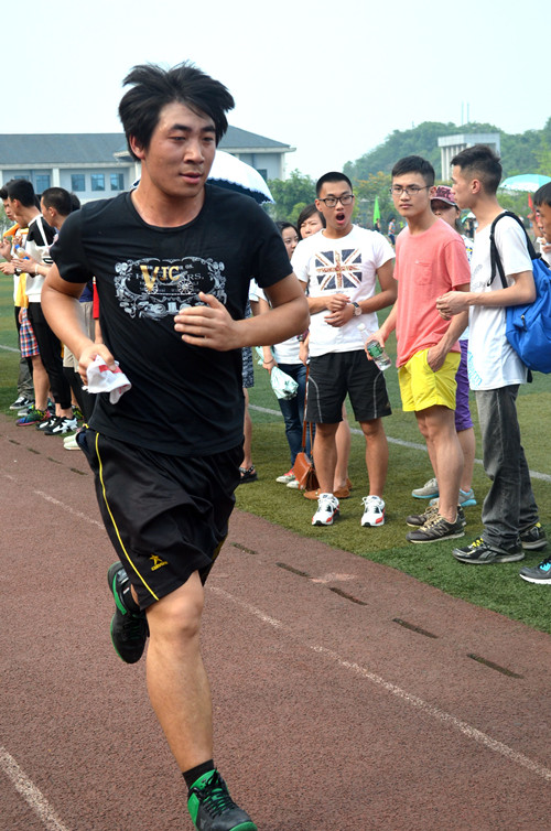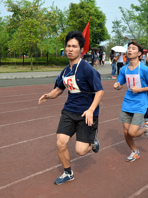 2015年4月28日下午16:20,2015川外春季运动会学生组男子3000米决赛在西校区体育场举行。这是本次运动会的压轴赛事,53名选手分两组参与这场比拼耐力与毅力的长跑角逐,研究生院也派出史博伟和沈哲伦两位同学。烈日炎炎,两名同学挥汗如雨,却依然凭借顽强的毅力坚持到了终点,为这次运动会画上完美的句号。