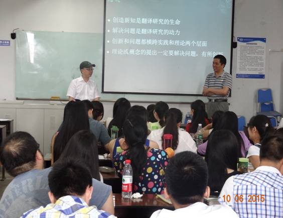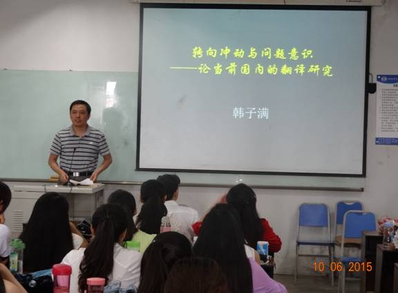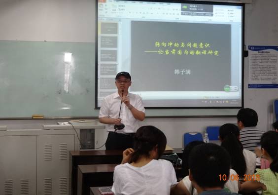 6月10日上午,解放军外国语学院博士生导师韩子满教授莅临我校,为我校师生带来了一场题为《转向冲动与问题意识——论当前国内的翻译研究》的讲座。讲座由我校研究生院副院长、博士生导师胡安江教授主持。高伟、朱雪莲、黄钰洁等老师及翻译理论与实践方向的研究生聆听了本次讲座。 韩教授首先向在场的老师和同学们讲述了他本人通过参加学术会议和大量阅读文献发现了翻译研究中涉及到的转向问题,同时对此问题进行了批判性的思考。他先是将国内对“转向”说引进及传播的总体情况进行了梳理和分析,同时指出国内的论文大多只针对翻译研究中的某一种转向,或者是只关注到了转向中的积极方面。继而将翻译研究中的转向进行了分类和详细阐释。随后,韩教授对“转向”说的实质进行了解释,他指出“转向”说反映了翻译研究的跨学科性,同时强调“转向”是个大杂烩,不完全是跨学科研究的套路,不完全是翻译研究新方向,描述的也不完全是翻译研究,并分别加以实例进行分析。韩教授指出,翻译研究“转向”有四个内容,分别为跨学科的理论资源,包括其他学科的理论、概念及方法等;研究的对象;研究方法;已发生变化的描述。经过对内容的深入解读,韩教授进一步挖掘了“转向”说的不足,即说法不够严谨,容易产生误解;过多过滥,不反映翻译研究的真实情况;内容庞杂,使用随意,反映研究中的问题。涉及到的问题主要有:精确性不足;术语使用不规范;缺乏学科自信;对跨学科研究的危险估计不足以及国内翻译研究的特有问题,即跟风、浮躁、麻木。跟风主要指创新不足,盲目跟风。浮躁指研究没有深入性,大多都是单篇文章,对转向介绍也不够准确。麻木主要指脱离社会和翻译行业的现实,这里韩教授以26本以translation命名的小说以及国内的小说《翻译官》为例进行了解释和说明。随后,韩教授总结了“转向”说的三个成因,分别为其他学科的影响,理论创新的焦虑,跨学科研究的意识。通过对上述问题的分析,韩教授提出了出路和问题意识。韩教授首先给问题下了定义,即需要解决的矛盾,继而提出翻译研究中需要解决的矛盾,分别为对有价值但是鲜有研究的现象、人物、数据、方法等进行研究,以及有明显研究价值,前人也进行过研究,但是研究中存在不足的现象。韩教授强调,翻译研究中的问题意识的实质就是要创新,韩教授结合我校研究生所使用的教材,充分阐释了创新不应该刻板地局限在理论创新层面。最后,韩教授指出翻译研究应该关注的五类问题:翻译新现象,有待研究的旧现象,可以借鉴的新理论,已有的翻译研究,新的翻译研究方法。韩教授对以上五类问题又进行了充分地展开和阐释。 胡安江教授结合翻译理论与实践方向研究生所学课程对本次讲座进行了全面细致的总结。他呼吁同学们在搜集文献的时候要遵循穷尽原则,要对文献进行甄别,对正反观点进行梳理,要提出个人的创新观点。同时,胡教授也提到一门独立的学科需要有自己的理论术语、研究对象和研究方法。胡教授还倡导听众多多借鉴韩教授在研究中所采用的研究途径,即发现不足、分析成因、寻找出路、解决问题。 韩教授的讲座引发了与会者的热烈响应。讲座在一片热烈的掌声中落下帷幕。同学们纷纷表示,韩子满教授的讲座让自己受益匪浅,不仅使自己从新的视角认识到了翻译研究中的“转向”说,也开启了我们翻译研究的新的征程。
