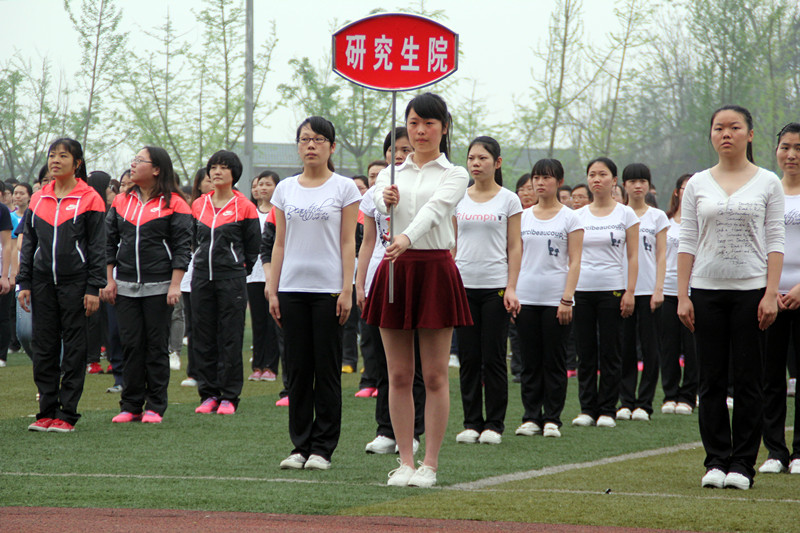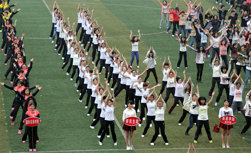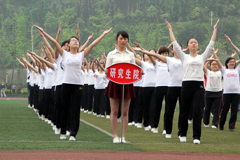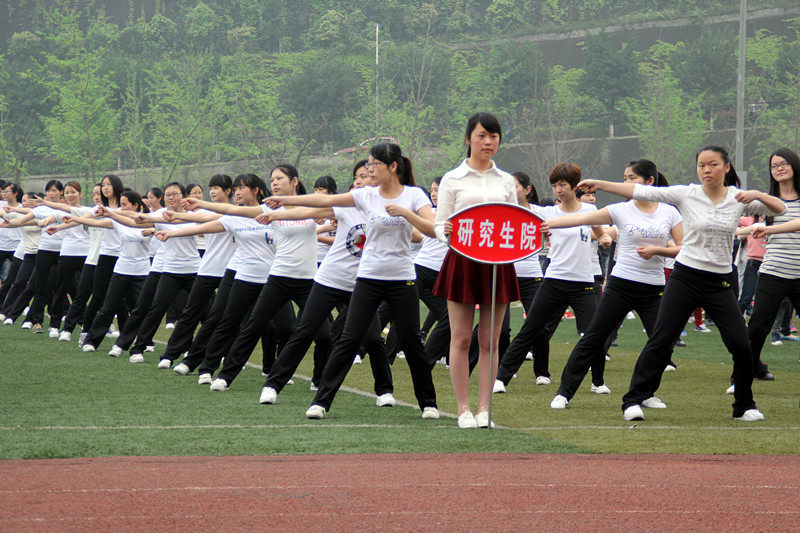 2014年4月11日下午5时,在所有竞技比赛项目结束之后,本届川外春季运动会最后一个项目——学生团体广播操表演在西校区体育场拉开帷幕。研究生院广播操表演队和来自全校其他院系的25支代表队一起,为全场观众奉献了一场精彩的广播操表演。伴随着音乐的节拍,我院广播操队员们用整齐的队列,标准的动作赢得了看台上的全体校领导以及现场观众们的阵阵掌声。为了准备本次表演,我院广播操表演队员们花费半个多月的时间进行了赛前排练,不论刮风下雨还是艳阳当空,他们都坚持按时训练,运动会上的精彩表现也凝聚着他们辛勤的汗水。感谢各位队员们辛苦的付出和精彩的表现!