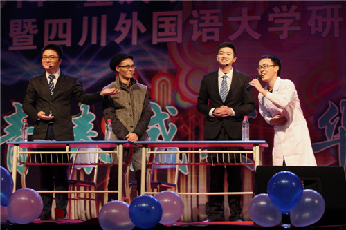 川外各研究生培养单位选送的节目也同样精彩。翻译学院陈潇潇等带来的肚皮舞给现场观众带来了别样精彩,在弥漫着阿拉伯风情并夹杂着现代时尚元素动感的音乐下,观众们的身体也随着她们摇摆起来。新闻传播学院带来的音乐剧《新文艺传青春》更是将音乐和情景剧结合到极致,一幕幕熟悉的校园场景勾起了同学们无数的青春遐想与回忆。研究生院和东方语学院舞蹈串烧《宫商角徵羽》和《Tell Me》,美女和帅哥轮番上演舞蹈盛宴,掌声和欢呼声此起彼伏,台上台下成了一片激情四溢的海洋。俄语系带来的傣族舞《云之南》、德语系歌伴舞《贝加尔湖畔》,舞步如燕雀般轻盈,一俯身,一拂袖,尽是唯美与诗意。研究生院带来的小品《神龙水》、音乐剧《小苹果》匠心独运,搞笑的情节引得场下阵阵欢笑。东方语学院带来的激动人心的魔术表演《幻境》充满悬疑,环环相扣引得在场观众惊叫连连。晚会在翻译学院和俄语系合唱《山楂树》的欢快旋律中缓缓落下帷幕。