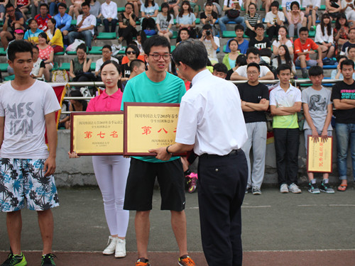 开幕式上,我院的方阵队同学们衣着整齐划一,亮丽多彩,步调一致,口号嘹亮,得到领导和观众的一致好评;排舞队的同学们个个青春阳光、舞姿优美,高难度的舞蹈动作更是让人眼前一亮。赛场上,运动员们个个精神饱满,斗志昂扬,充分展现了同学们积极向上,顽强拼搏的优良品质。尤其值得一提的是,径赛男子4*100米,我院洪亮、张洋、张坤、杨银兴四名同学不负众望,以52秒14的成绩取得了第8名的好成绩。另外,杨银兴同学参加的跳远项目以5.22米为我院争得第8名。同样值得表扬的还有女子跳高项目,王婉如同学跳出1.21米的优异成绩获得第5名,可谓是巾帼不让须眉。赛后,王婉如激动的说:“作为研二的学生,很高兴还能再为研院尽些绵薄之力。真心感谢烈日下为我加油为我服务的同学。谢谢大家!明年有时间,我们再来!”我们不得不为他们感到骄傲与自豪。