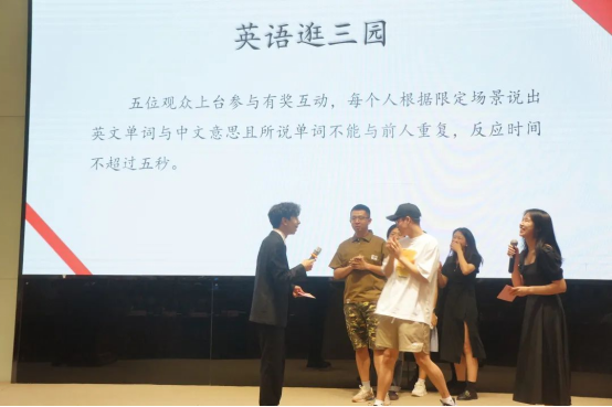 在1—5号选手比赛完后进入中场休息,由主持人为现场观众带来了“英语逛三园”的游戏,主持人邀请五位观众上台参与有奖互动,大家根据限定场景说出英文单词与中文意思。大家都积极参与其中,氛围轻松愉快,也赢得了阵阵掌声。